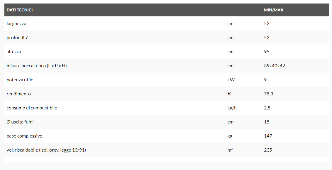 - Ciocchi di legna fino a 40 cm di lunghezza (posizionati in verticale)