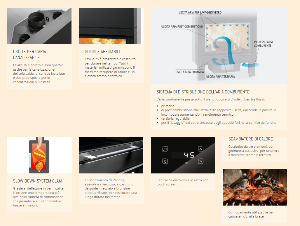 Favilla 75 è dotato di ben quattro uscite per la canalizzazione dell’aria calda,