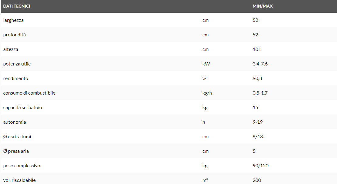 Stufa a pellet stagna a sezione rotonda con porta curva in acciaio e vetro piano. La porta, priva di griglie, e i fianchi presentano decorazioni in bassorilievo.