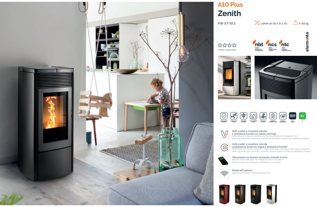 Stufa a pellet ad aria, top in maiolica, rivestimento in acciaio verniciato, grande visione della fiamma, vetro ceramico resistente a 800°C, ampio cassetto cenere, sistema di pulizia automatico del braciere, ventilazione frontale maggiorata di serie ed escludibile, una canalizzazione posteriore (optional), funzionamento a convezione naturale a qualsiasi potenza, software elemento di serie.