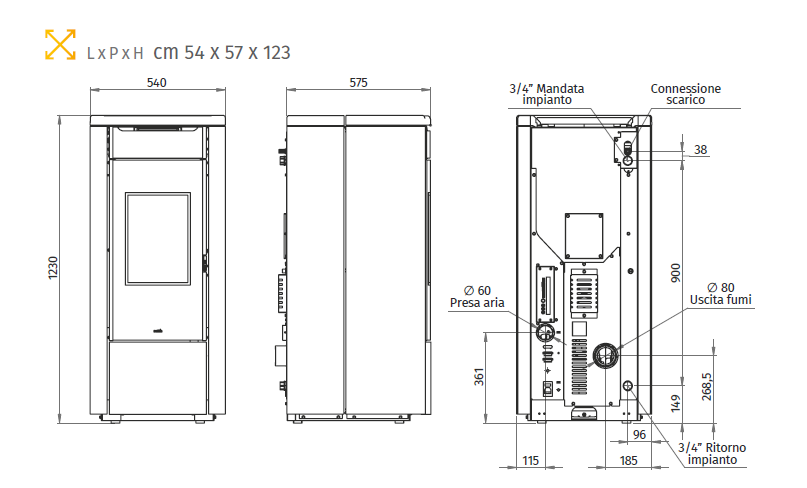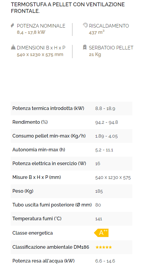 Termostufa a pellet ad acqua, top in maiolica smaltata, rivestimento in maiolica smaltata, grande visione della fiamma, vetro ceramico resistente a 800°C, doppio vetro frontale serigrafato, ampio cassetto cenere, sistema di pulizia automatico del braciere, ventilazione frontale di serie escludibile, circolatore ad alta efficienza di serie, vaso di espansione capacità 6 lt, sistema di pulizia automatico del fascio tubiero, valvola di sicurezza a 3 bar di serie, trasduttore di pressione di serie, controllo temperatura ritorno di serie, software elemento di serie.