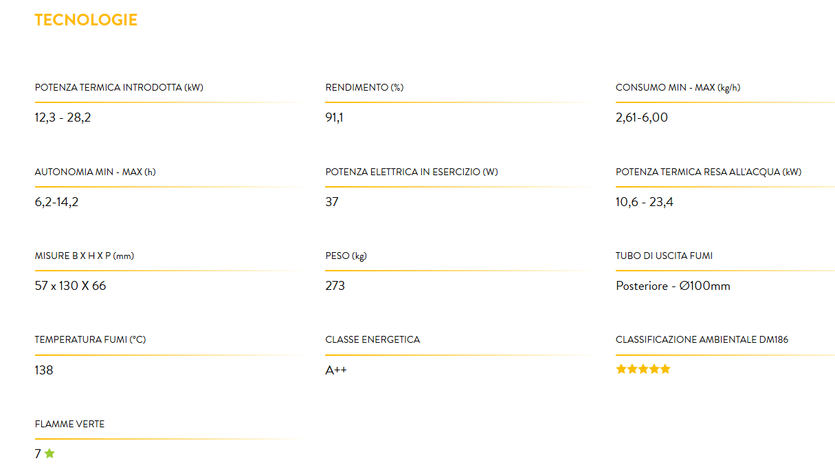 Termostufa a pellet ad acqua, top in maiolica smaltata, rivestimento in maiolica smaltata, grande visione della fiamma, vetro ceramico resistente a 800°C, doppio vetro frontale serigrafato, ampio cassetto cenere, sistema di pulizia automatico del braciere, ventilazione frontale di serie escludibile, circolatore ad alta efficienza di serie, vaso di espansione capacità 6 lt, sistema di pulizia automatico del fascio tubiero, valvola di sicurezza a 3 bar di serie, trasduttore di pressione di serie, controllo temperatura ritorno di serie, software elemento di serie.